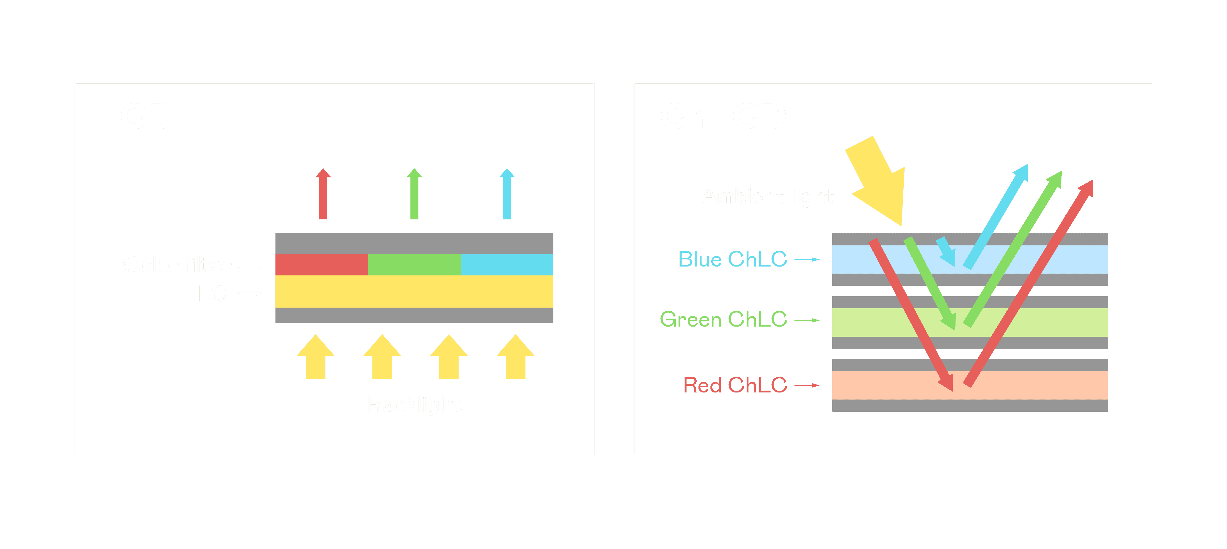 ChLCD 胆固醇液晶就如同纸张一样,,,,透过反射环境光来显示影像,,,因此长时间观看不易造成人眼视觉疲劳,,,可达到护眼效果。。。。当处于户外阳光下使用,,LCD 影像容易失真而不易观看,,,,但胆固醇液晶仍可维持较佳的影像品质。。。