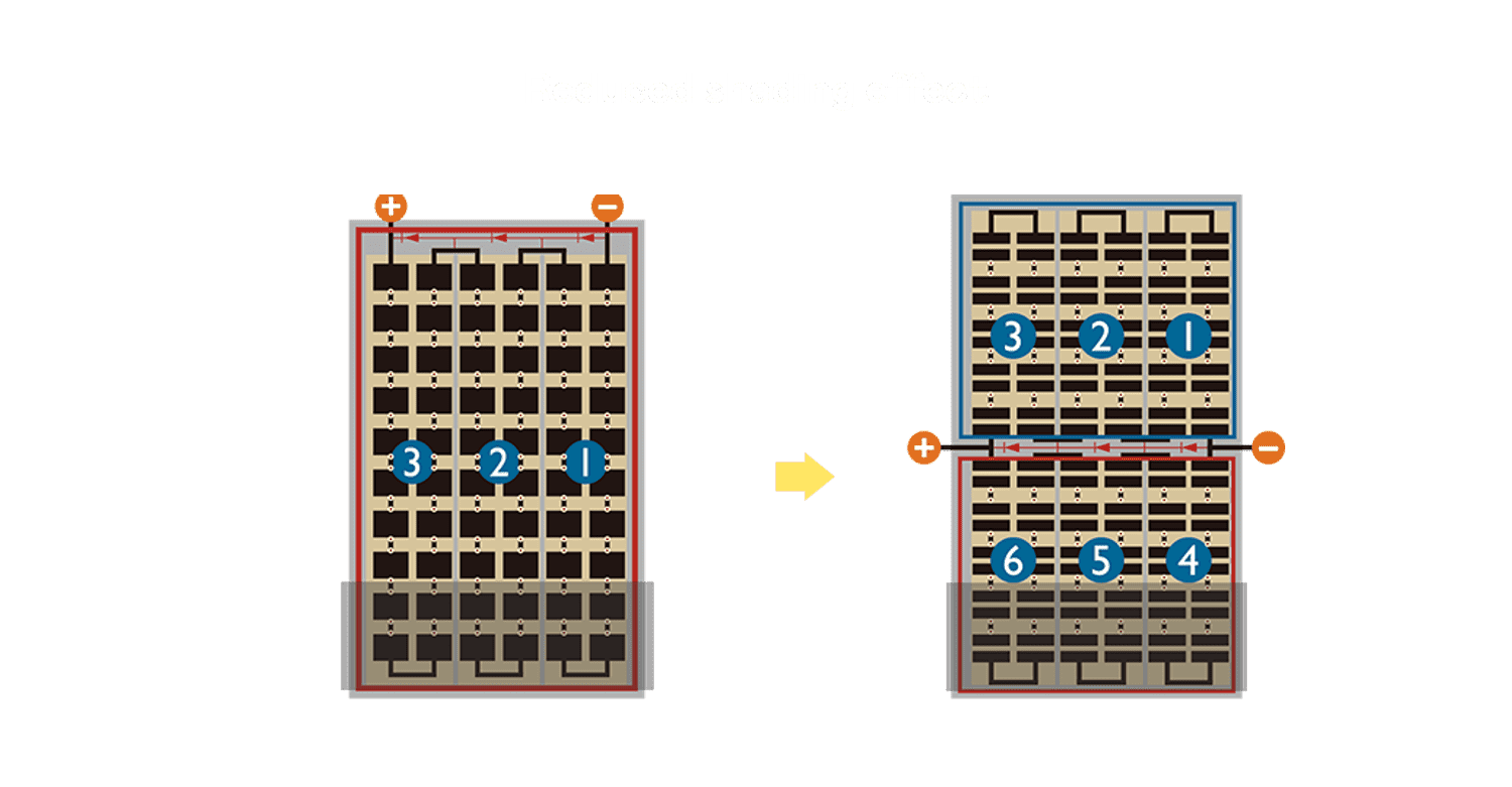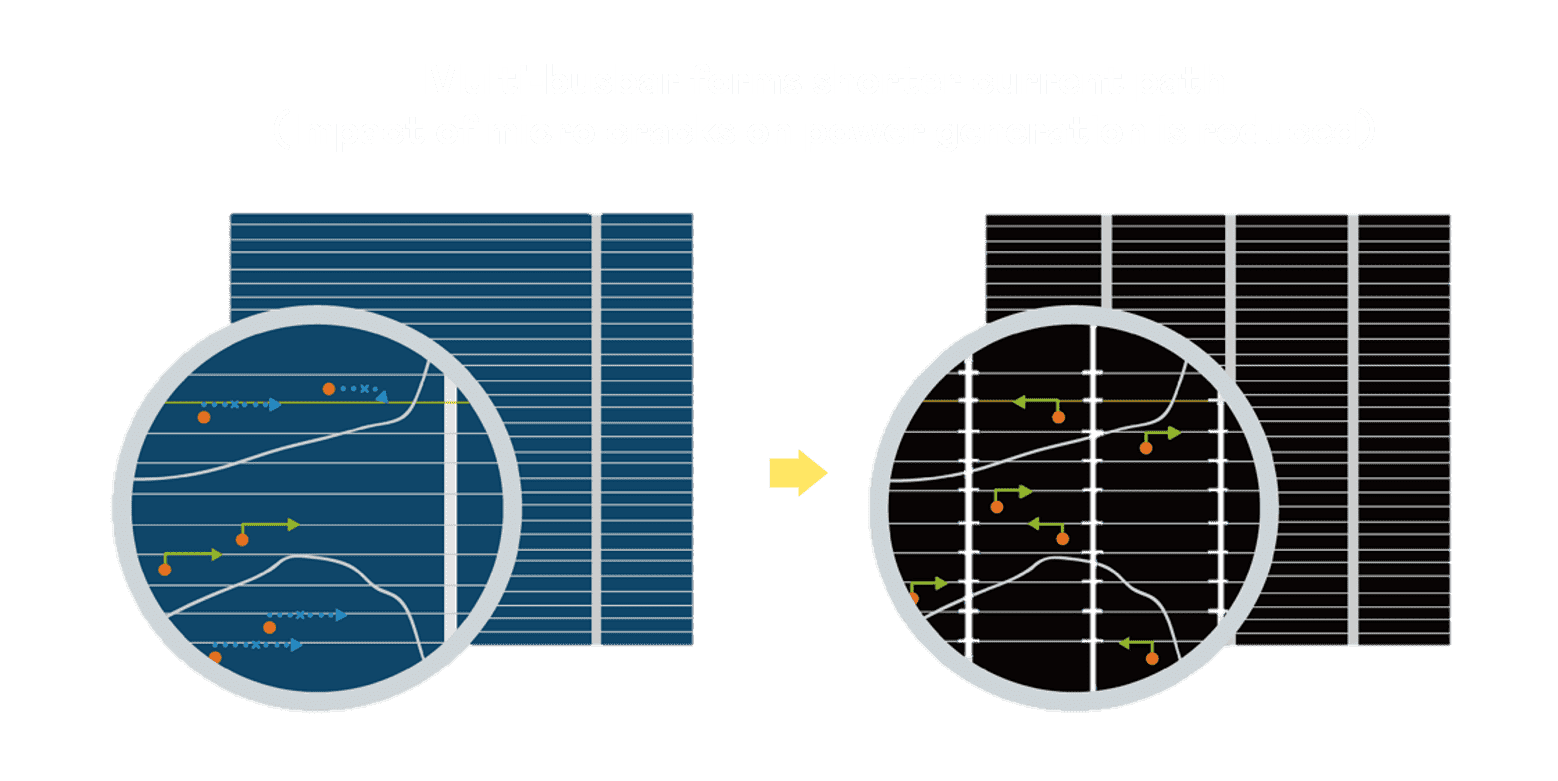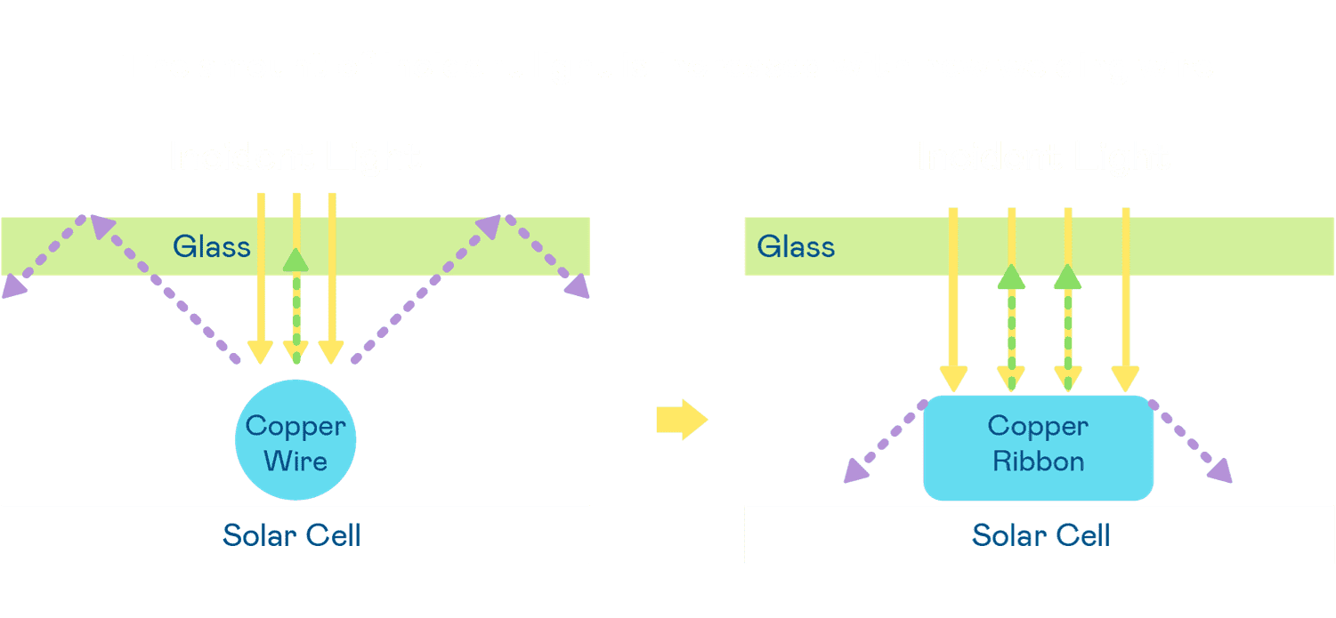 - 电池使用多条铜导线 (Copper wire) 于电池片上形成较短的电流路径,,,提高电流收集效率,,,,采用圆形设计的铜导线较传统扁平式的铜焊带 (Ribbon),,,可增加入射至电池的光线量。。。。